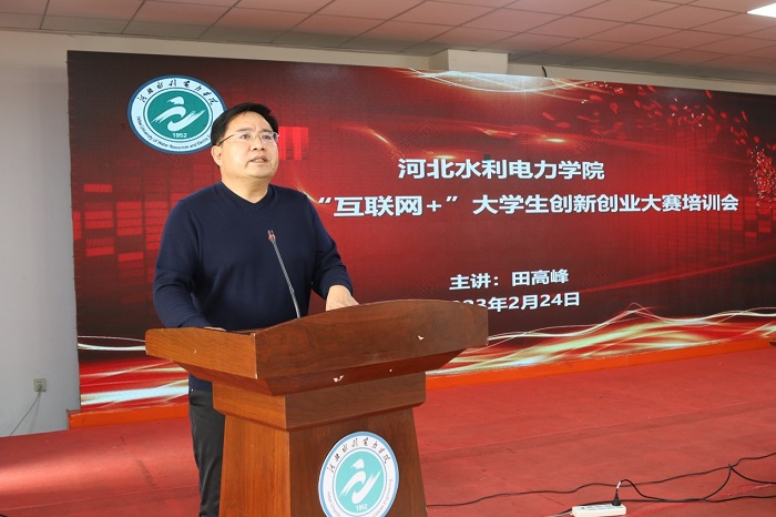 为进一步做好我院2023年“互联网+”大赛宣传动员工作,2月24日下午,我院“专家进校园”系列活动—2023年“互联网+”大学生创新创业大赛培训会议在启智楼B402召开。新道科技股份有限公司河北分公司副总经理田高峰作为主讲嘉宾做现场专题培训。学院副院长王建明、教务处、科技处、财务处、各系党总支书记主任、师生代表共计260余人参加了培训。会议由招生就业处处长侯锡铭主持。